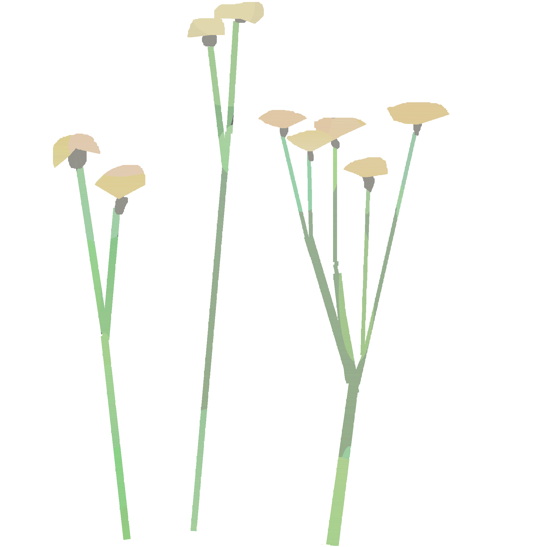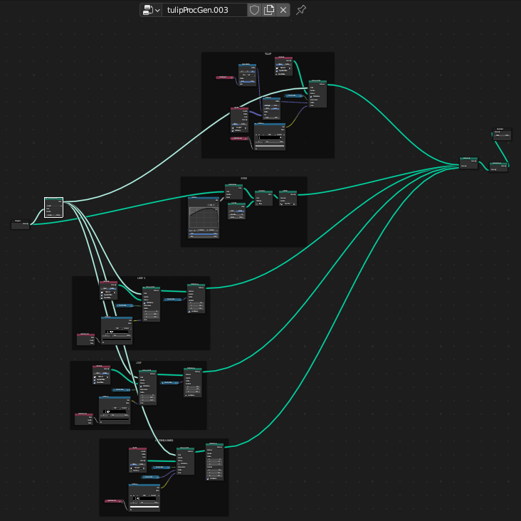 When generating tulips, we instantiate the flower head at the tip of the spline. We also instantiate the leaves in three different ways in the lower section of the spline. These sections use collections of 4-6 assets to increase variation, and these assets were created directly from photo reference.